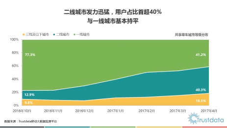 亮點一:共享單車積極布局二線城市。 隨著共享單車的渠道布局下沉, 2017 年 4 月,二線城市用戶規(guī)模占比達到40.3%,比去年 10 月的12.9%,提高了27. 4 個百分點,漲幅明顯。共享單車在二線城市的用戶占比,已經與一線城市基本持平,成為共享單車市場最重要的增量市場。