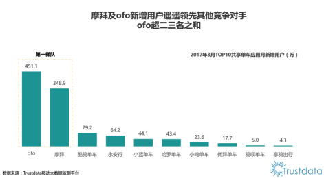 ofo運用成熟的構架與技術,采用統(tǒng)一系統(tǒng),產(chǎn)品也不停更新,越來越輕便,越來越人性化,騎行體驗非常。而摩拜單車前期產(chǎn)品卻不盡如意,初版一輛車三四千元的造價,而用戶體驗卻是一團糟,重量高達30kg,可能你不小心摔了,被單車一壓,感覺就再也起不來了。之后上線的二代產(chǎn)品沒有防泥擋板,下雨天騎行十分未便利。反映在數(shù)據(jù)層面兩者有很大差別,TrustData發(fā)布的《2017年Q1中國共享單車行業(yè)用戶監(jiān)測陳訴》顯示,ofo本年3月ofo新增用戶451.1萬,排名第一,排名第二、第三的摩拜、酷騎別離新增用戶348.9萬和79.2萬,ofo月增用戶已經(jīng)超摩拜、酷騎之和。ofo月活用戶增速已經(jīng)連續(xù)7個月超過摩拜。