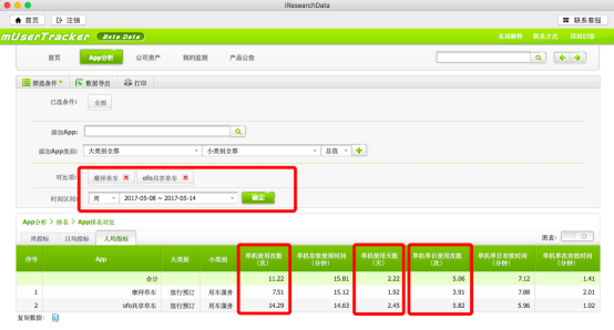 艾瑞最新周度數(shù)據(jù)顯示ofo單機使用次數(shù)為14.29,而摩拜僅為7.51,ofo超出摩拜近2倍。單機單日使用次數(shù)方面,ofo為5.82次,摩拜僅為3.91次,差距也很明顯,用戶已用腳投票選出了本身喜歡的單車。