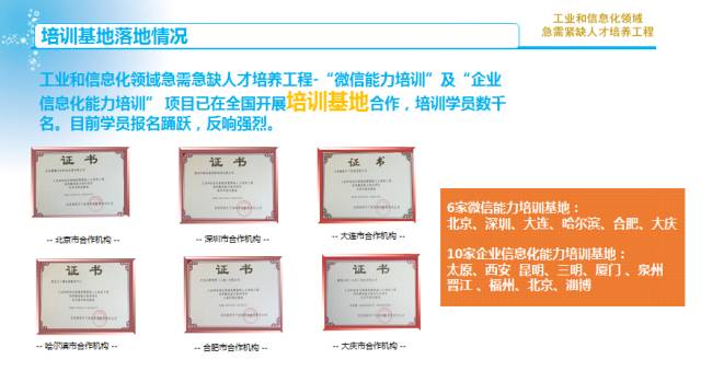 于立娟還介紹,圍繞互聯(lián)網(wǎng)+國(guó)家戰(zhàn)略落地生根及專業(yè)人才快速增長(zhǎng)的不停需求,人才已成為互聯(lián)網(wǎng)+國(guó)家戰(zhàn)略發(fā)展的關(guān)鍵所在。工業(yè)和信息化領(lǐng)域緊缺人才培養(yǎng)工程工作組從人才培養(yǎng)的準(zhǔn)確性、有效性、高端性、專業(yè)性等方面落地互聯(lián)網(wǎng)+人才培訓(xùn),推出的微信能力培訓(xùn)項(xiàng)目已納入工業(yè)和信息化領(lǐng)域急需緊缺人才培養(yǎng)工程,盡心盡力地培養(yǎng)互聯(lián)網(wǎng)+專業(yè)人才。