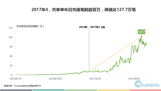 Trustdata最新4月數(shù)據(jù)還顯示,共享單車(chē)用戶日充值筆數(shù)繼續(xù)連結(jié)快速增長(zhǎng)勢(shì)頭,峰值達(dá)127.7萬(wàn)筆,周末及節(jié)假日會(huì)出現(xiàn)階段性高峰。隨著用戶付費(fèi)習(xí)慣的不停強(qiáng)化、新盈利模式的不停探索,共享單車(chē)長(zhǎng)期被詬病的盈利難題或?qū)⒌玫骄徑狻?/p>