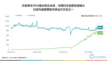 Trustdata最新數(shù)據(jù)反映了共享單車(chē)行業(yè)的整體發(fā)展趨勢(shì):隨著共享單車(chē)開(kāi)創(chuàng)的“最后一公里”深度滿足市民短途出行需求,低碳環(huán)保的出行理念日漸深入人心,共享單車(chē)已成為最重要的共享出行方式之一。2017年4月,共享單車(chē)用戶規(guī)模連結(jié)強(qiáng)勁增長(zhǎng)勢(shì)頭,用戶規(guī)模已經(jīng)接近網(wǎng)約車(chē),成為最重要的共享出行方式之一。根據(jù)目前的增長(zhǎng)趨勢(shì),2017年第二季度末,共享單車(chē)有望超越網(wǎng)約車(chē),成為用戶規(guī)模最大的共享出行方式。
