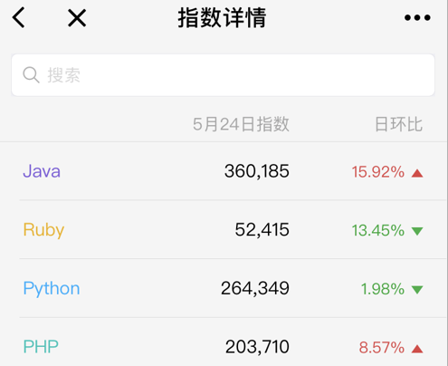 而一個(gè)語(yǔ)言的發(fā)展后勁在于有多少新生力量關(guān)注和進(jìn)入這個(gè)領(lǐng)域,通過(guò)網(wǎng)絡(luò)搜索指數(shù)也能看出差別語(yǔ)言的受關(guān)注情況。