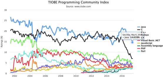 來(lái)自TIOBE排行榜的數(shù)據(jù)顯示,自 2002 年以來(lái),Java常年高居熱門(mén)語(yǔ)言榜首,比來(lái)一年更是一枝獨(dú)秀。而C語(yǔ)言比來(lái)下降比較厲害,已經(jīng)不及Java的一半熱度,其他語(yǔ)言從比來(lái)十年來(lái)看,跟Java和C語(yǔ)言還不是一個(gè)檔次的熱度。