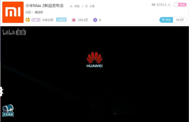 騰訊科技訊5 月 26 日消息,小米Max2 發(fā)布會于昨天下午舉行,然而讓人大為不測的是,在發(fā)布會的視頻直播中,居然出現(xiàn)了長達近 2 分鐘的華為Logo,一時間場面非常尷尬,不過官方很快恢復了信號源。一時不少米粉以為小米發(fā)布會被華為“黑了”。