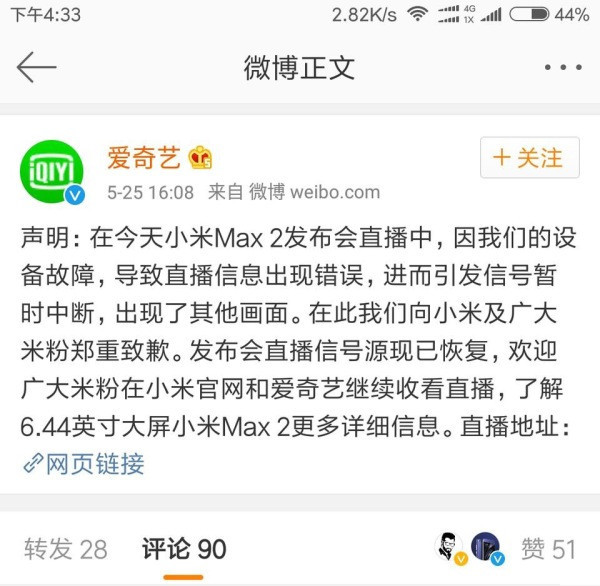 在今天小米Max2 發(fā)布會直播中,因我們的設備故障,導致直播信息出現(xiàn)錯誤,進而引發(fā)信號暫時中斷,,出現(xiàn)了其他畫面。在此我們向小米及廣大米粉鄭重致歉。發(fā)布會直播信號源現(xiàn)已恢復,歡迎廣大米粉在小米官網(wǎng)和愛奇藝繼續(xù)收看直播,了解6. 44 英寸大屏小米Max2 更多詳細信息。由于我們工作的失誤,對小米和華為造成了負面的影響,也對熱愛這兩個品牌的粉絲造成了困擾。愛奇藝對此事負責,再次向大家報歉!