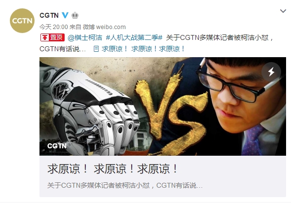 昨晚,CGTB官微在微博置頂報(bào)歉文章《求原諒!求原諒!求原諒!》,就記者用英文向柯潔提問(wèn)體現(xiàn)報(bào)歉,解釋英語(yǔ)是工作語(yǔ)言,理解柯潔所說(shuō)“中國(guó)記者向中國(guó)旗手提問(wèn)應(yīng)該用中文”。