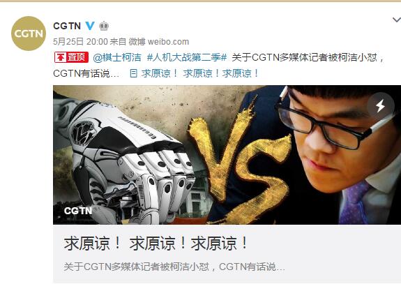 站長(zhǎng)之家(Chinaz.com)5月26日消息:昨晚央視旗下CGTV(中國(guó)國(guó)際電視臺(tái))官方微博就記者用英文向柯潔提問(wèn)體現(xiàn)報(bào)歉。