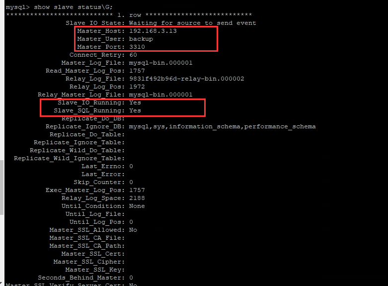 change master to master_host='192.168.3.13',master_user='backup',master_password='123456',master_log_file='mysql-bin.000001',master_log_pos=0,master_port=3310;