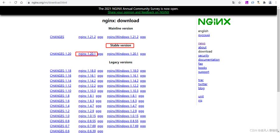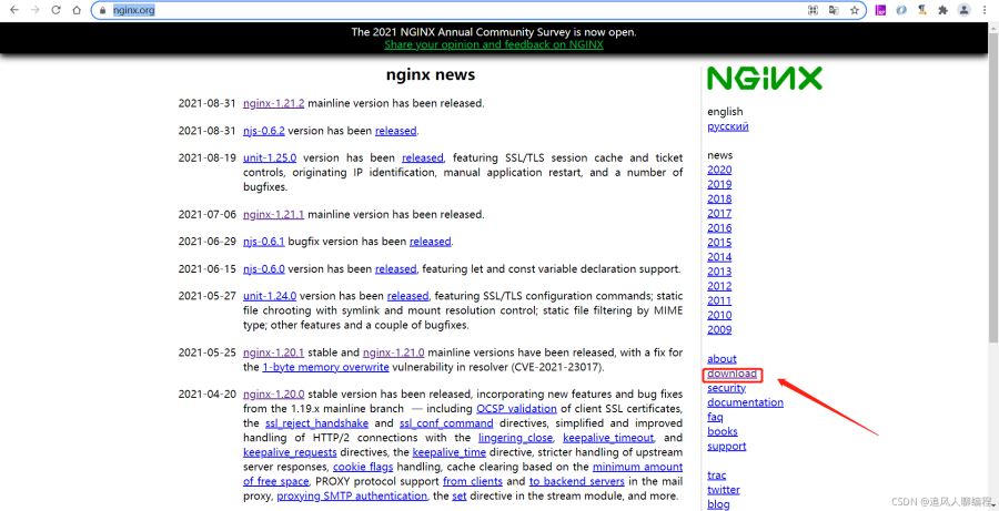 1)進(jìn)入Nginx官網(wǎng)(https://nginx.org/),點(diǎn)擊 download 鏈接