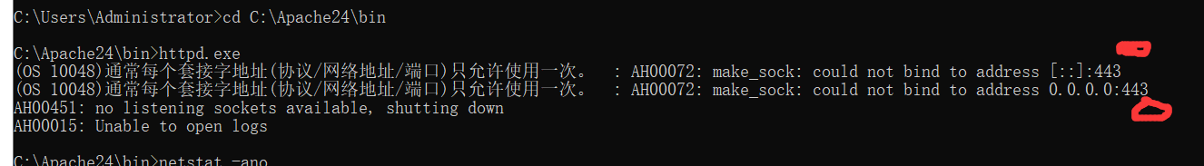 2、以管理員身份cmd,進(jìn)入Apache24/bin目標(biāo)下,執(zhí)行httpd.exe