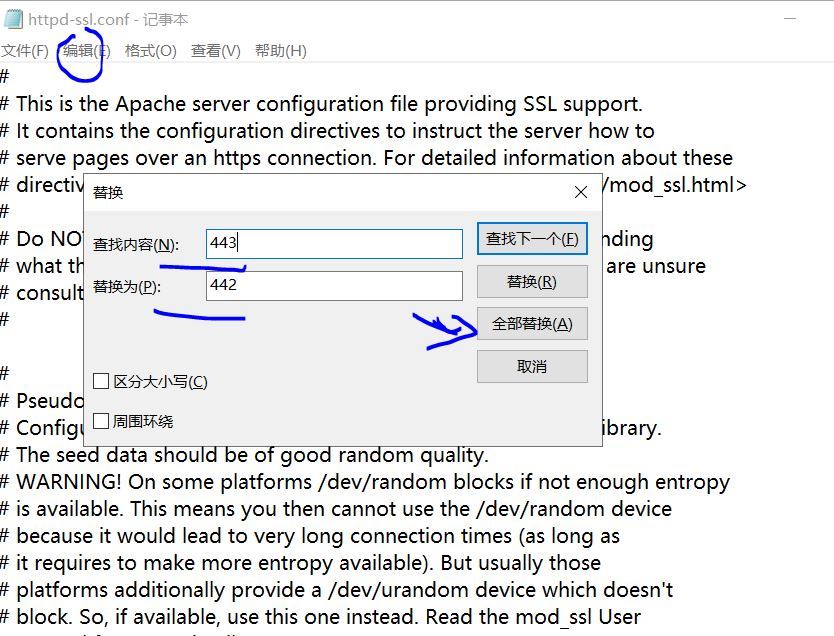 將兩個(gè)文件里的443替換成端口號里不存在的任意數(shù)字(如442)(右鍵——打開方式——以記事本打開——編輯——替換)