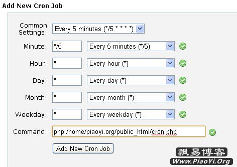 注:如果你的命令寫的不對,你會在你的郵箱中收到類似 “/bin/sh: /home/www.piaoyi.org/public_html/cron.php: Permission denied”或者“No such file or directory”這樣的錯誤提示;成功執(zhí)行的話,郵箱中會收到類似“X-Powered-By: PHP/5.2.13 Content-type: text/html”這樣的代碼。