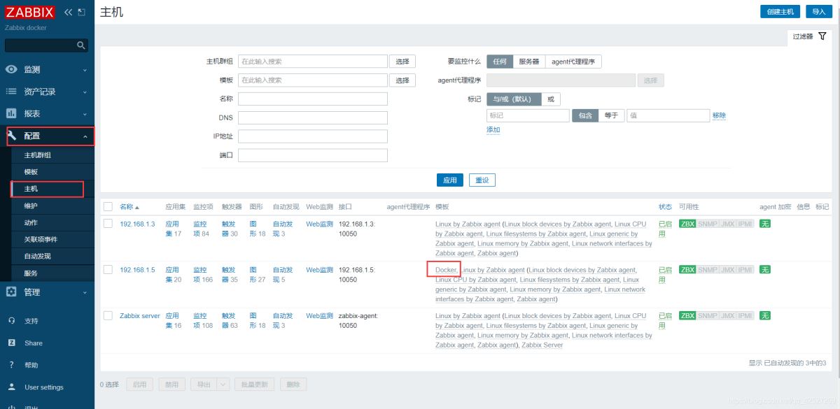 更新后我們就可以在配置——主機(jī)中看到監(jiān)控項(xiàng)中有了docker