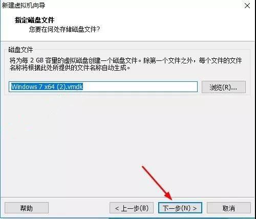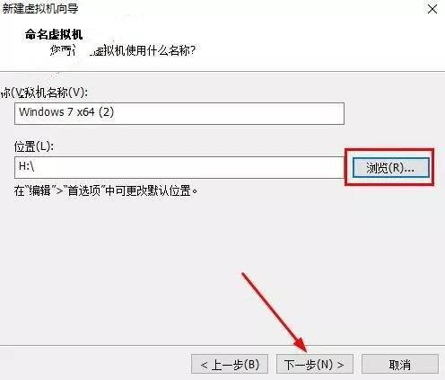 8.點擊瀏覽設(shè)置虛擬機(jī)存放的位置,我這里選擇存放到H盤(建議用戶選擇到除C盤以外的其它盤),點擊下一步。