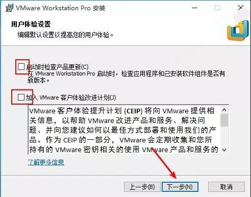 6.取消勾選檢查產(chǎn)品更新和客戶體驗改進(jìn)計劃,點擊下一步。