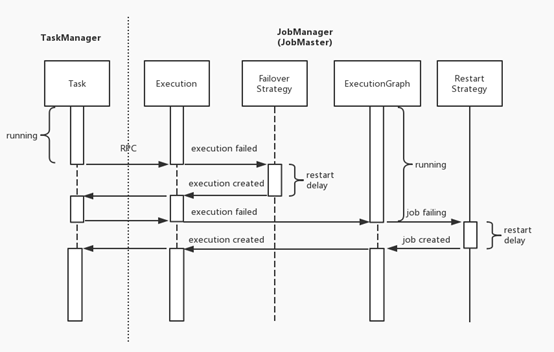 Flink 的錯誤恢復(fù)機(jī)制分為多個級別,即 Execution 級別的 Failover 策略和 ExecutionGraph 級別的 Job Restart 策略。當(dāng)出現(xiàn)錯誤時,F(xiàn)link 會先嘗試觸發(fā)范圍小的錯誤恢復(fù)機(jī)制,如果仍處理不了才會升級為更大范圍的錯誤恢復(fù)機(jī)制,具體可以看下面的序列圖。