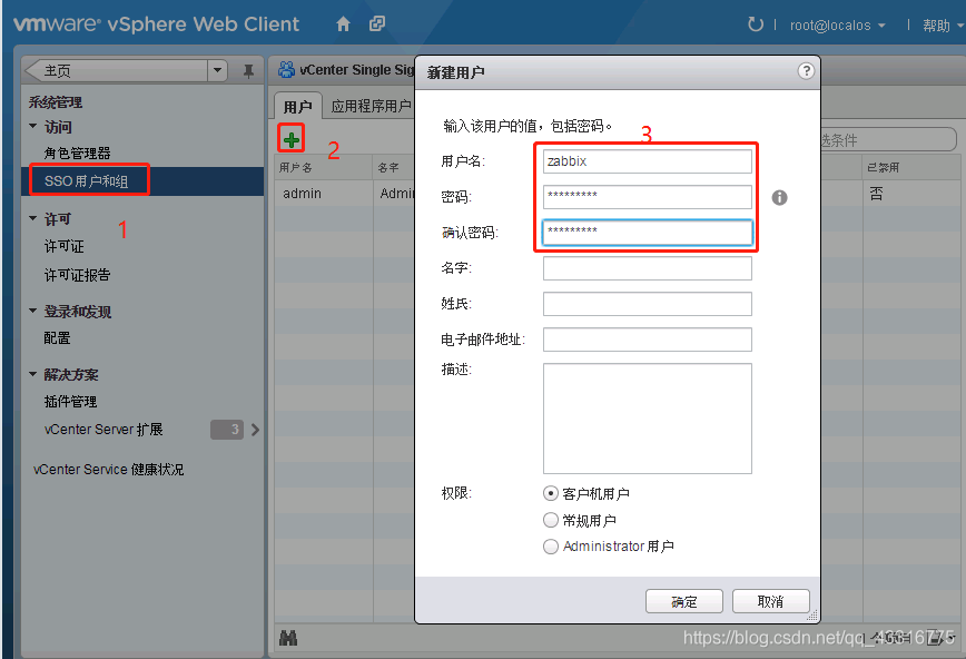 1、進入虛擬化vcenter中,用瀏覽器登錄(客戶端沒找到地方設置),新建一個只讀用戶zabbix。