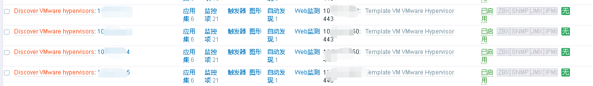 注:過一會就可以看到很多主機了,主機的添加是全自動的,依靠vcenter里面的自動發(fā)現(xiàn),如果將VMS關閉那么將無法添加虛擬化中的虛擬機,hypervisors用來發(fā)現(xiàn)添加exsi主機。根據(jù)自己的監(jiān)控內(nèi)容選擇自動發(fā)現(xiàn)開啟項目,默認是全開的。
