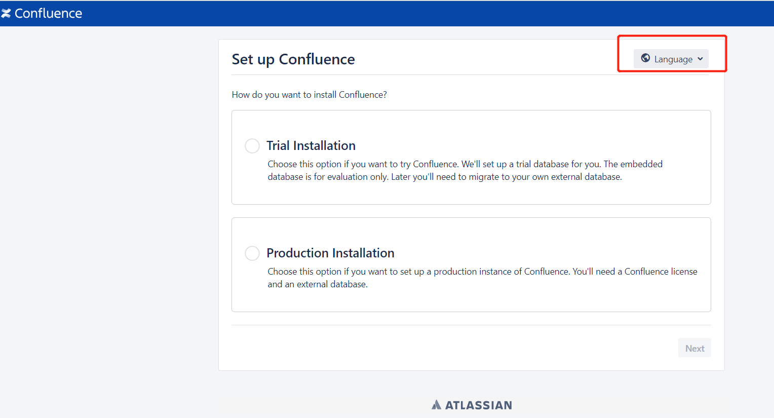 瀏覽器打開confluence訪問頁面:http://172.16.11.248:7080,既可以看到confluence安裝配置頁面