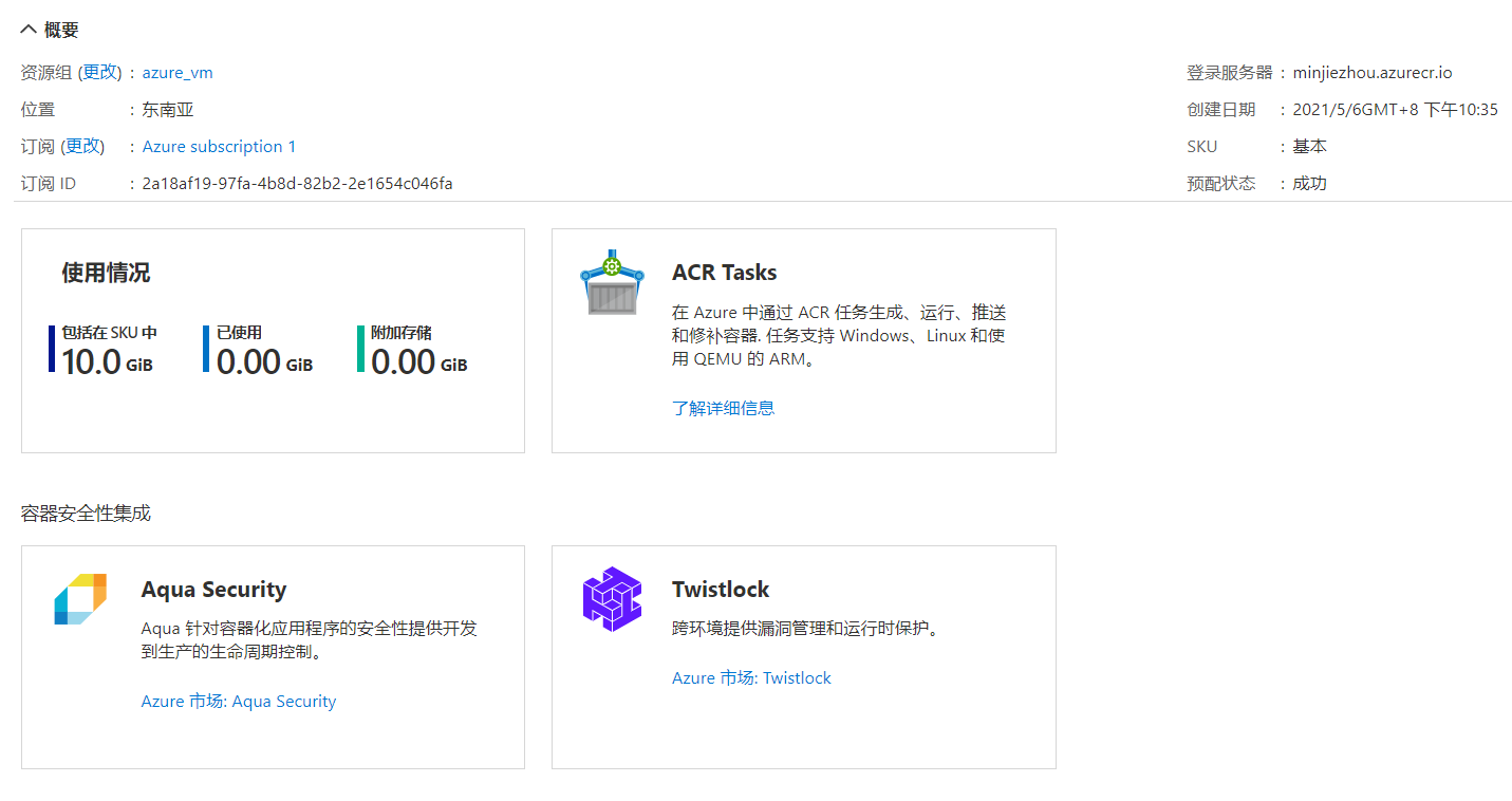 在經過幾秒鐘的等待后我們的資源就被創(chuàng)建好了,點擊“轉到資源”可以查看Azure Container Registry的概要信息。