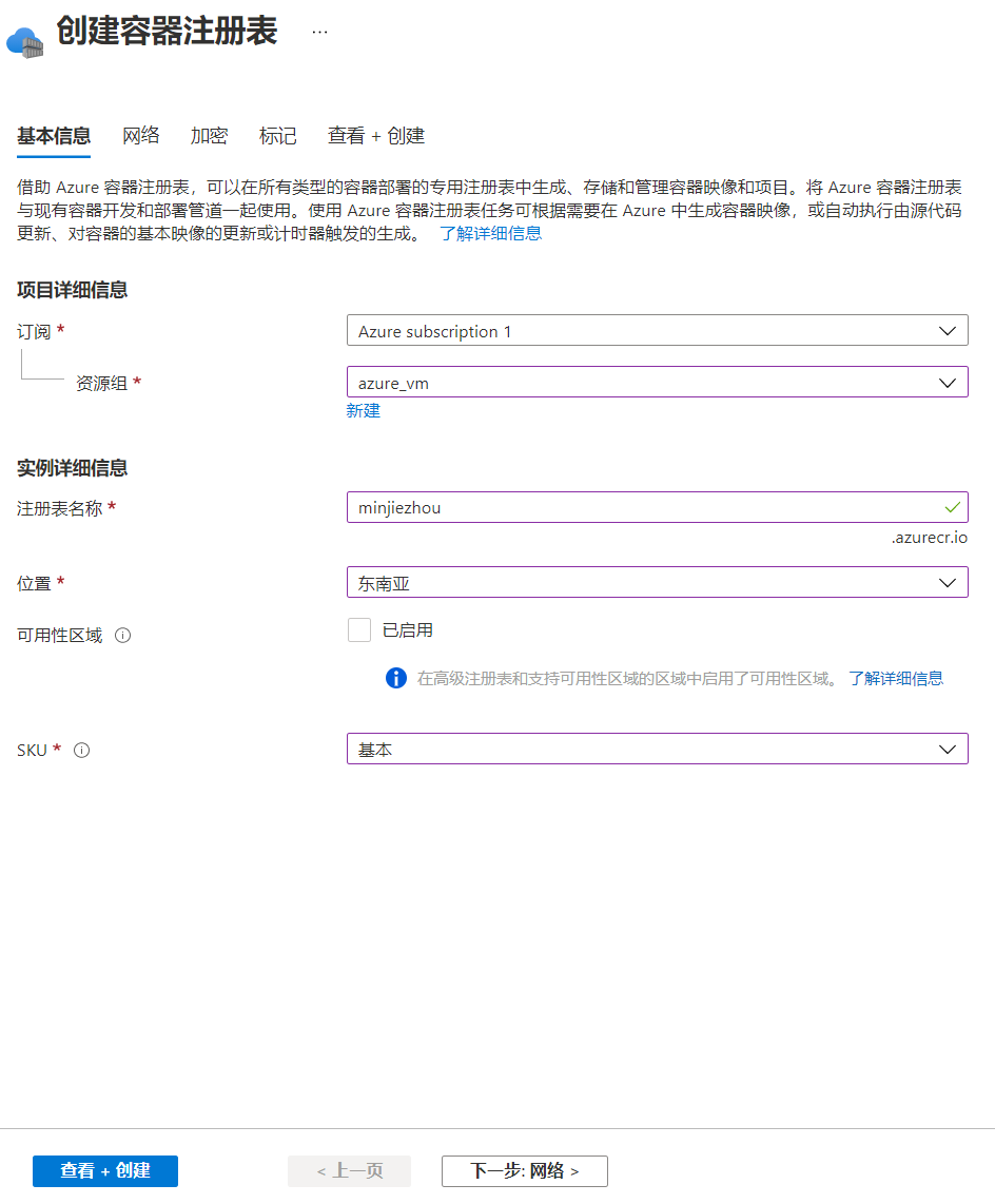 在彈出的創(chuàng)建界面填寫資源組、注冊表名稱等信息。