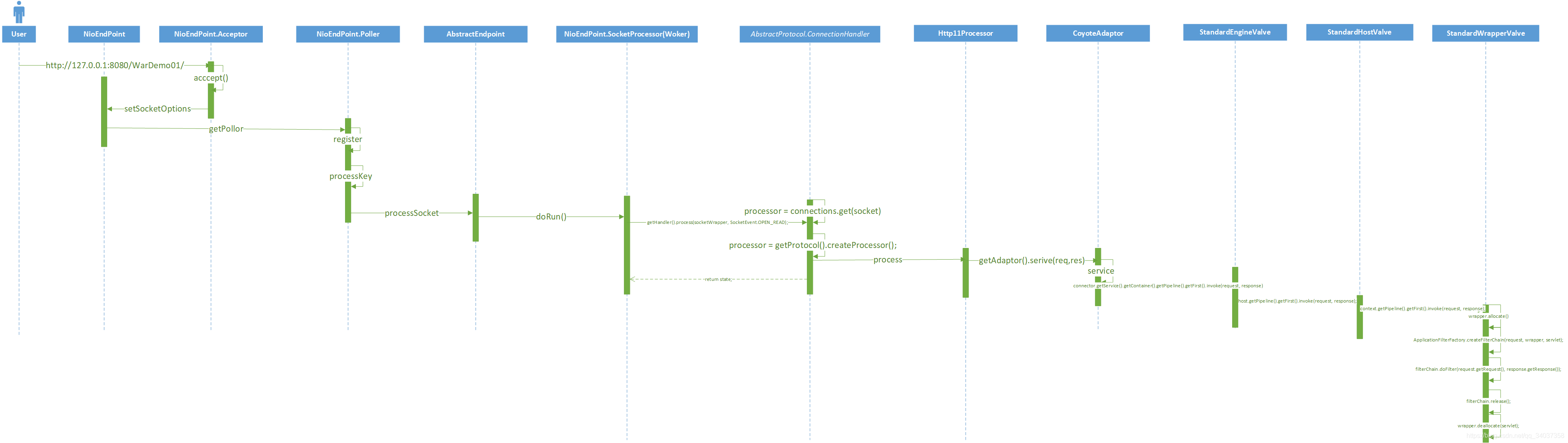Connector對象創(chuàng)建的時候,會創(chuàng)建Http11NioProtocol的ProtocolHandler,在Connector的startInteral方法中,會啟動AbstractProtocol,AbstractProtocol啟動NioEndPoint進(jìn)行監(jiān)聽客戶端的請求,EndPoint接受到客戶端的請求之后,會交給Container去處理請求。請求從Engine開始經(jīng)過的所有容器都含有責(zé)任鏈模式,每經(jīng)過一個容器都會調(diào)用該容器的責(zé)任鏈對請求進(jìn)行處理。