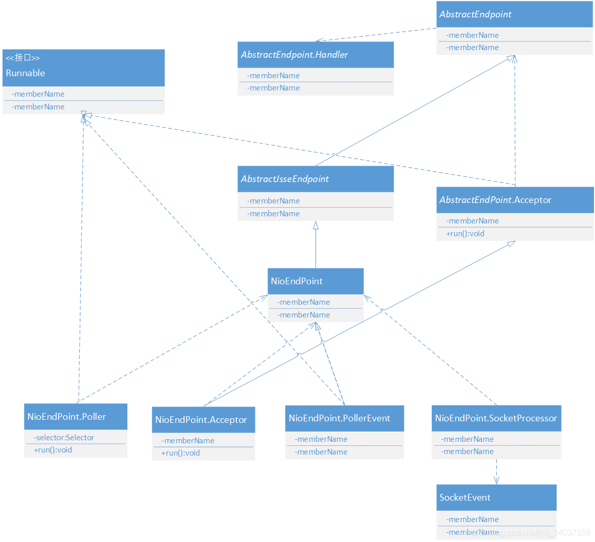 默認(rèn)的EndPoint實(shí)現(xiàn)是NioEndPoint,NioEndPoint有四個內(nèi)部類,分別是Poller、Acceptor、PollerEvent、SocketProcessor、NioSocketWrapper。