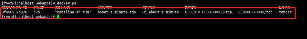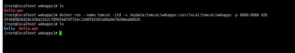 docker run --name tomcat -itd -v /mydata/tomcat/webapps:/usr/local/tomcat/webapps -p 8080:8080 d2b