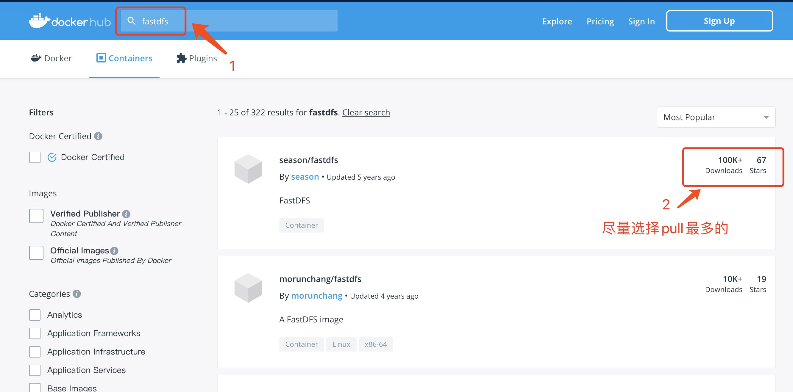 補(bǔ)充: 其實(shí)看這些鏡像的描述也能看出一些區(qū)別來(lái)的,比如 ygqygq2/fastdfs-nginx,該鏡像是整合了 Nginx 的 fastdfs,那么新的問(wèn)題來(lái)了,為什么要整合 Nginx?因?yàn)閷?duì)于 fastdfs 來(lái)說(shuō),安裝后只能在本機(jī)訪問(wèn)… 我上傳文件肯定是為了能夠訪問(wèn)的呀,所以為了提供 web 訪問(wèn),那么就需要集成 Nginx 了,但是比如就是想自己?jiǎn)为?dú)搞 Nginx… 那么肯定就不會(huì)選了嘛,season/fastdfs 鏡像相對(duì)純凈些,本文就是基于 season/fastdfs 鏡像的,后面也附帶配置 Nginx…