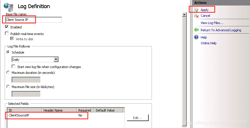 在”Base file name”字段中輸入“Client Source IP”;然后點(diǎn)擊”Select Fields”按鈕,并選擇”ClientSourceIP”;最后點(diǎn)擊”應(yīng)用”,回到主頁(yè);