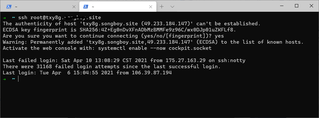 這種方法需要在節(jié)點(diǎn)的docker啟動(dòng)程序中添加參數(shù),因此我需要先登錄到節(jié)點(diǎn)服務(wù)器中去,ssh登登錄服務(wù)器的命令如下所示