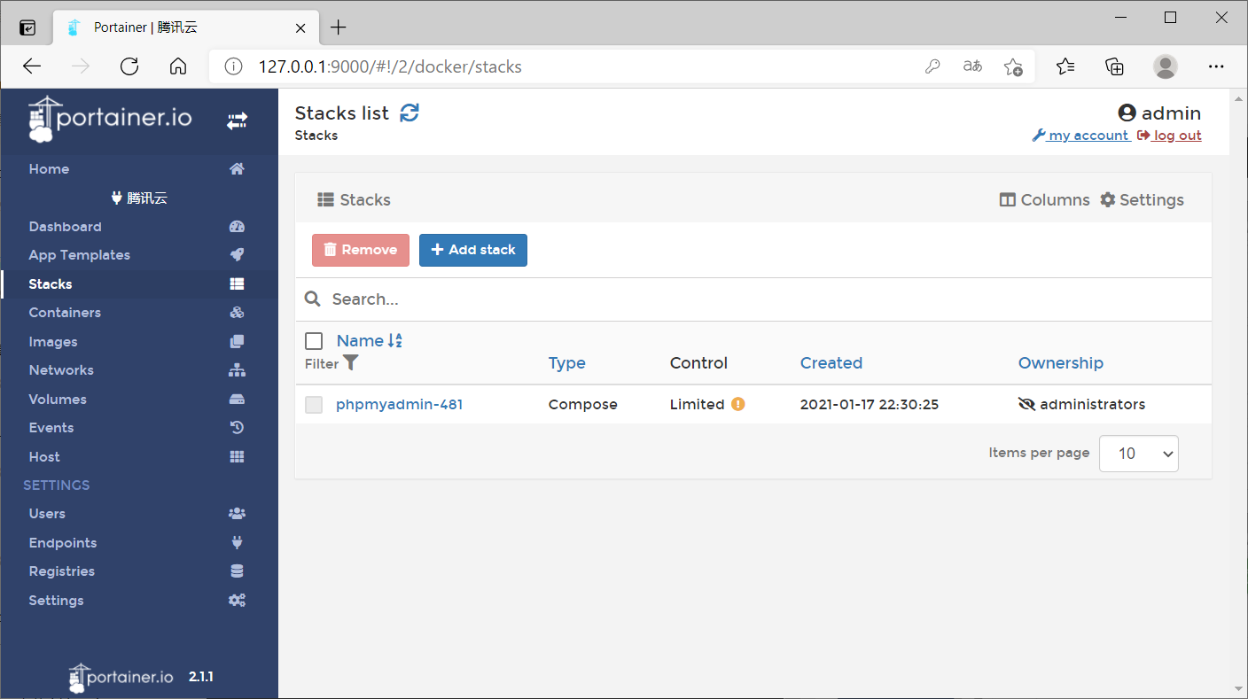 除了在容器列表頁(yè)部署容器之外,Portainer系統(tǒng)還支持使用docker-compose的方式進(jìn)行部署,在Portainer系統(tǒng)中叫做stacks,在菜單欄中選擇此項(xiàng),可以進(jìn)入docker-compose服務(wù)的列表,如下圖所示