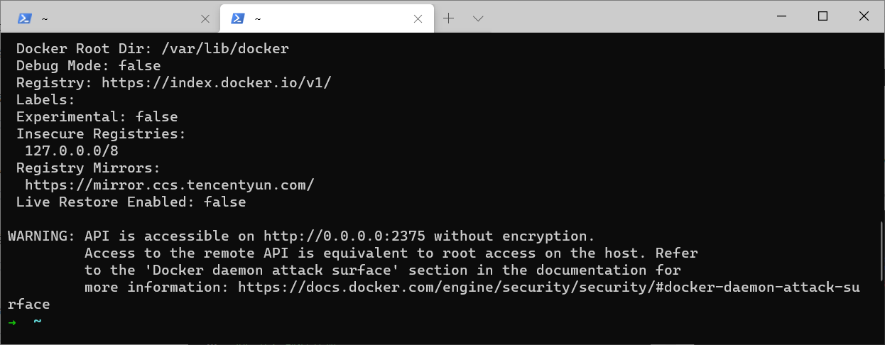 在上圖中可以看到docker給了一個(gè)warning的警告提示,告知我開(kāi)啟遠(yuǎn)程訪問(wèn)會(huì)存在安全風(fēng)險(xiǎn),這里暫時(shí)不理會(huì)它,不過(guò)出現(xiàn)這個(gè)提示說(shuō)明確實(shí)是開(kāi)啟了遠(yuǎn)程訪問(wèn)的功能
