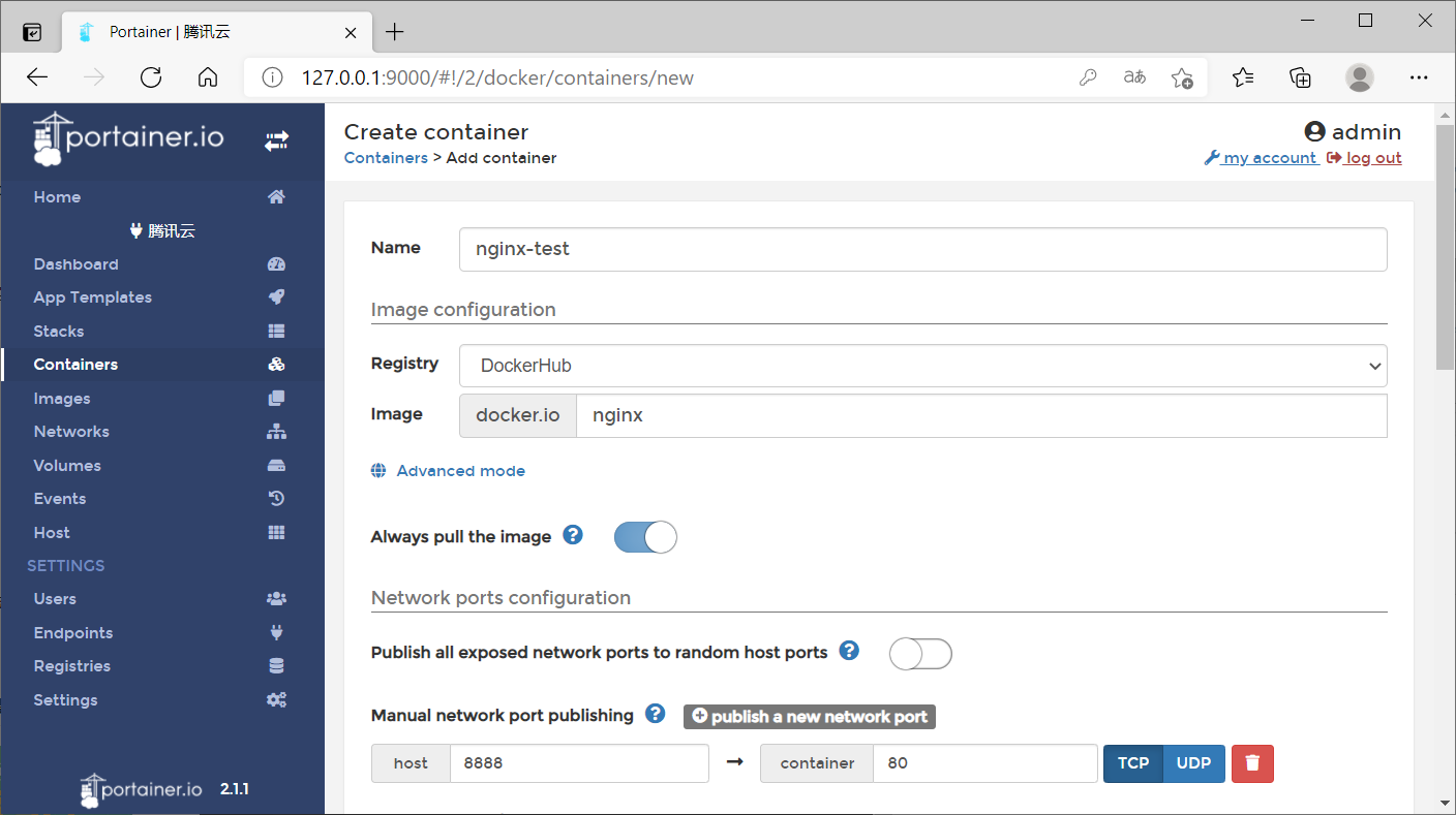 在上圖所示的頁(yè)面中,需要將docker鏡像地址填寫(xiě)進(jìn)去,這里我隨意選舉了一個(gè)nginx鏡像,并且將主機(jī)的8888端口映射到了容器的80端口,提交這些信息之后,Portainer系統(tǒng)會(huì)告知你容器運(yùn)行是否成功,如下圖所示