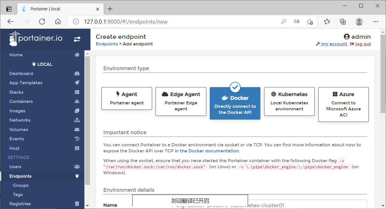 在上圖中可以看到有5個(gè)選項(xiàng),這里我選擇最簡(jiǎn)單的一種方式,使用Docker API進(jìn)行控制。
