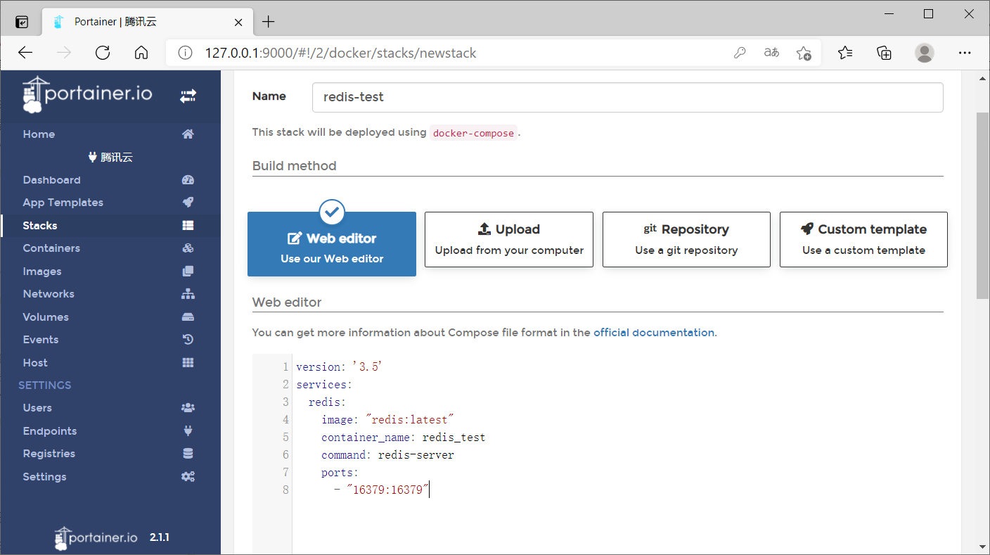 在上圖所示的頁(yè)面中,會(huì)要求我填寫(xiě)docker-compose的信息,這里我準(zhǔn)備了一個(gè)Redis服務(wù)的docker-compose的配置,配置代碼如下所示