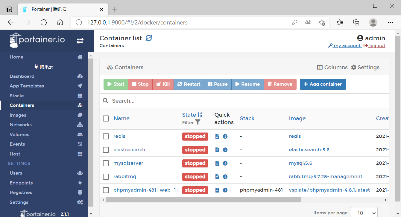 在上圖中可以看到容器列表中存在兩個(gè)容器,以及容器的運(yùn)行狀態(tài),也可以對(duì)這些容器進(jìn)行控制。