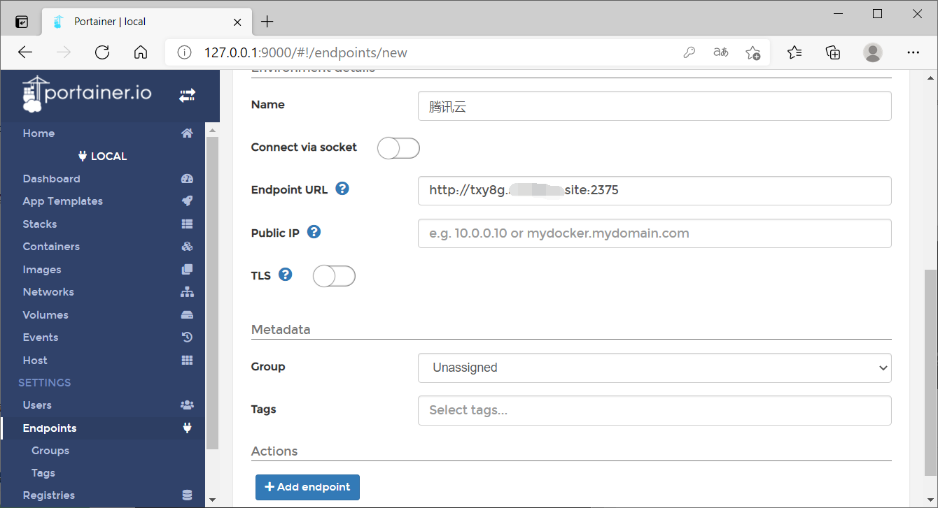 在上圖中可以看到,已經(jīng)有一個(gè)local的節(jié)點(diǎn),在列表上方有一個(gè)Add endpoint按鈕,點(diǎn)擊按鈕后就可以來(lái)到添加節(jié)點(diǎn)的詳情頁(yè),如下圖所示