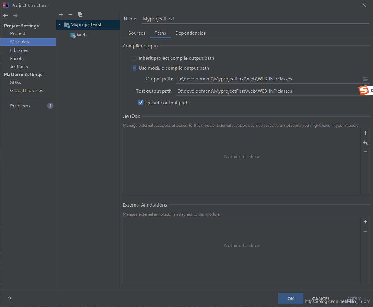 File -> Project Structure,打開(kāi)以下窗口。然后選擇Modules-- Paths – 勾選“Use module compile out path” ,并將Outputpath 和Test output path 都設(shè)置為剛剛創(chuàng)建的classes文件夾