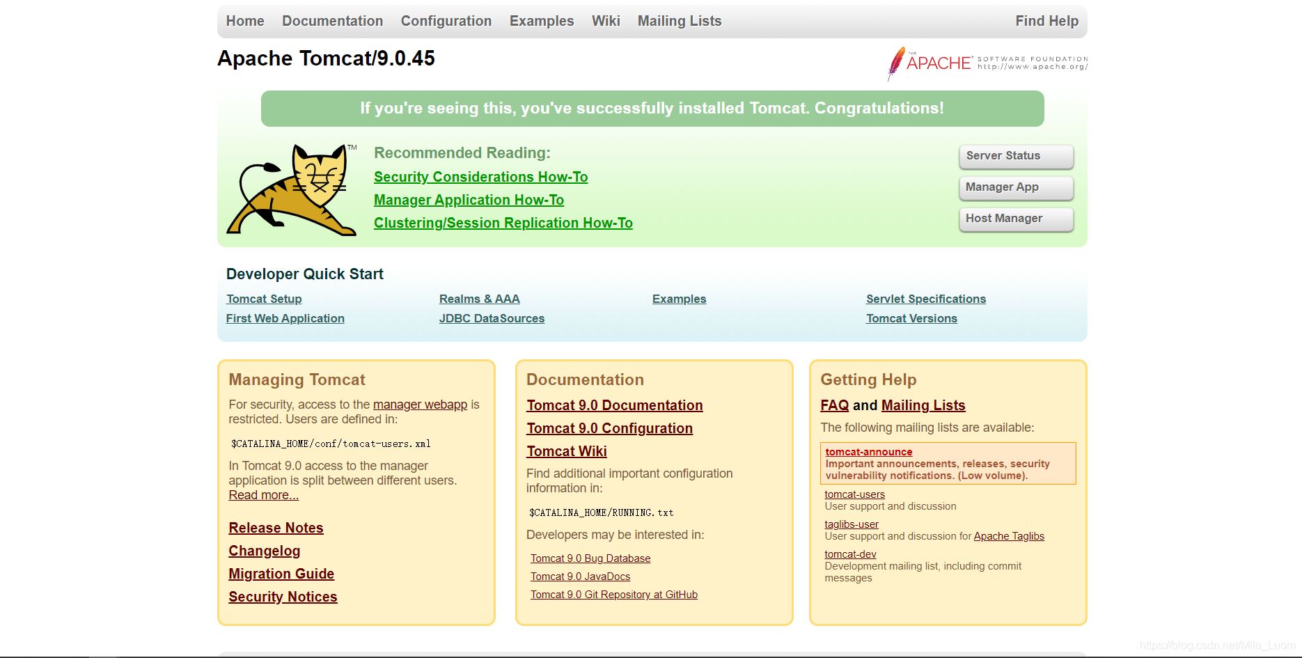4、在瀏覽器中輸入網(wǎng)址http://localhost:8080,出現(xiàn)以下界面表示Tomcat服務(wù)器已經(jīng)成功部署