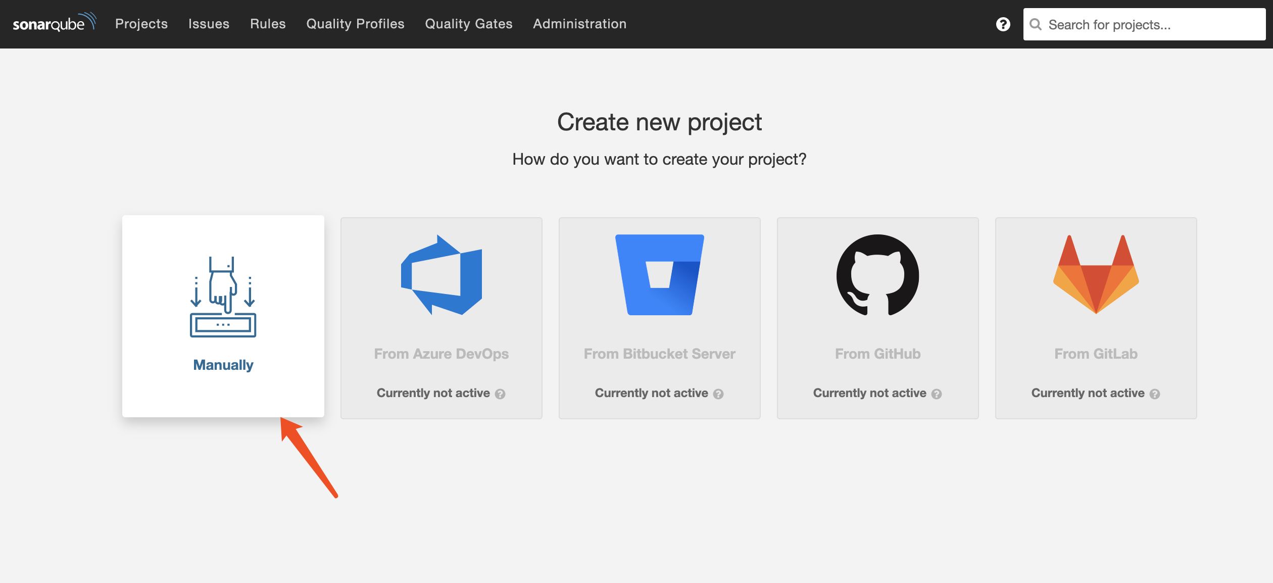 點擊 manually(手動的),這里也可以選擇github,在項目中使用git關(guān)聯(lián)sonar可以更方便的掃描代碼分支。