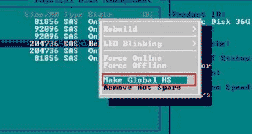 2) 可看到已配置RAID的硬盤狀態(tài)為Online,而未配置的硬盤狀態(tài)為Ready,將光標移動至想要配置為熱備盤的物理盤(硬盤狀態(tài)必須為Ready),按F2彈出菜單,選擇Make Global HS。