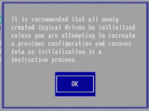 7. 上述的配置確認完成后,按Tab鍵,將光標移至OK處,按回車,會出現(xiàn)如下的提示,如果是一個全新的陣列,建議進行初始化操作,如果配置陣列的目的是為了恢復之前的數(shù)據(jù),則不要進行初始化。按回車確認即可繼續(xù)。