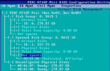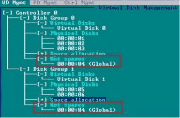 3) 確認選擇后,剛剛選擇的硬盤的狀態(tài)變?yōu)镠otspare,熱備盤配置完成,返回VD Mgnt,可以看到兩個RAID的熱備盤是同一個硬盤。全局熱備配置完成。