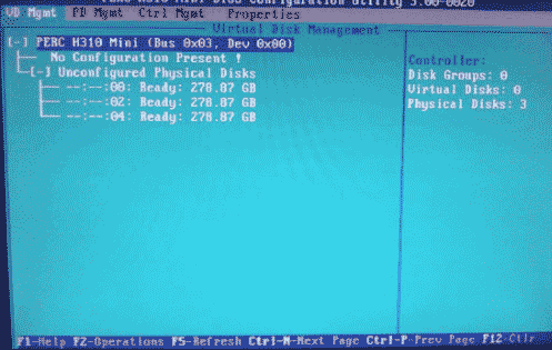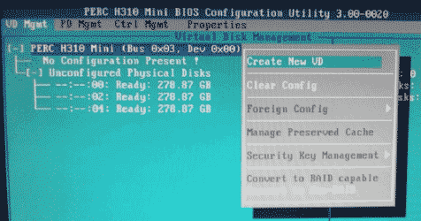3. 此時虛擬磁盤為空,按上下鍵使光標停留在陣列卡型號所在行(圖中的PERC H310 Mini),按F2彈出菜單,選擇Create New VD創(chuàng)建新的虛擬磁盤,如圖2-3所示:
