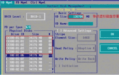 選擇完硬盤后按Tab鍵,可以將光標移至VD Size欄,VD Size可以手動設定大小,也就是說可以不將所有的容量配置在一個虛擬磁盤中。如果這個虛擬磁盤沒有使用我們所配置的RAID陣列所有的容量,剩余的空間可以配置為另外的一個虛擬磁盤,但是配置下一個虛擬磁盤時必須返回VD Mgmt創(chuàng)建。VD Name根據(jù)需要設置,也可為空。如圖2-5所示: