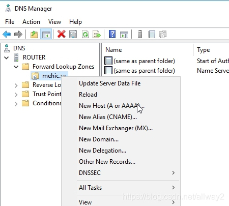 完成后,右鍵單擊新區(qū)域,然后選擇“新主機”(A或AAAA)
