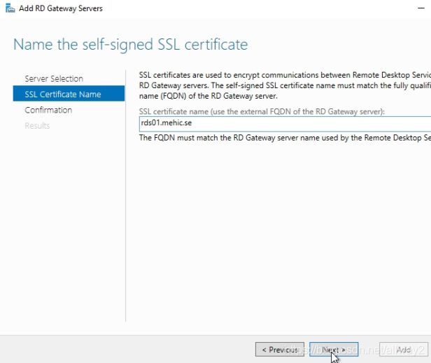 當我們通過向?qū)r,它將創(chuàng)建一個自簽名的SSL證書。稍后我將用Trusted替換該證書。在“ SSL證書名稱”頁面上,我將輸入我的RDS服務(wù)器rds01.mehic.se的完全合格域名。