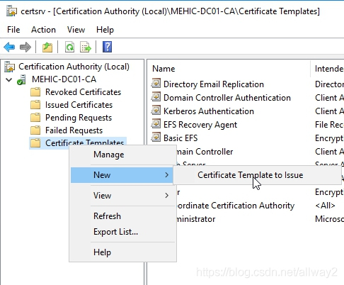 現(xiàn)在,我們需要獲取該模板并將其發(fā)布到CA。為此,請右鍵單擊證書模板–>新建–>要頒發(fā)的證書模板。
